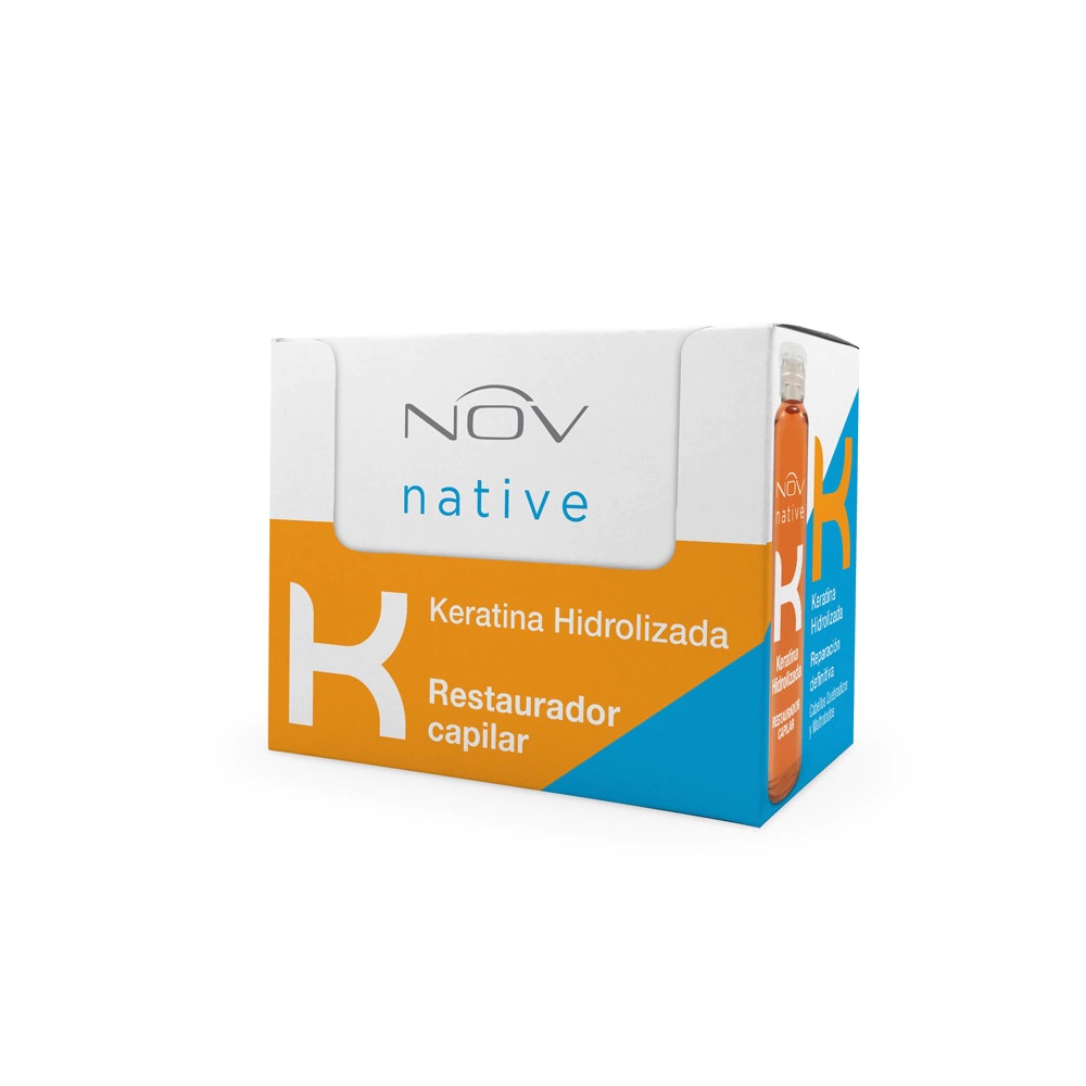 La línea NOV NATIVE K con Keratina Hidrolizada, reparación definitiva, especialmente diseñada para cabellos quebradizos y maltratados.